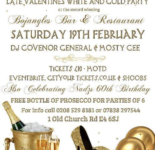 This February Velvet Rope invites you to a Late Valentine’s White and Gold Party (also celebrating Nadz’ 60th Birthday ) at the Award winning Bojangles Bar & Restaurant on Saturday the 19th of February.