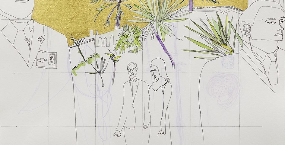 As though retrieved from a surreal flower press, people, plants and vessels are presented flattened and slightly out of shape; multiple minimalist selves cross architectural and art historical references; impressions of unrelated scenes captured on paper.