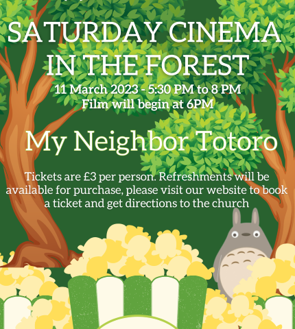 Screening of the animated film ‘My Neighbor Totoro’. Perfect for Studio Ghibli fans and families! Doors open at 5:30, film begins at 6. Tickets are £3, and refreshments will be available for purchase